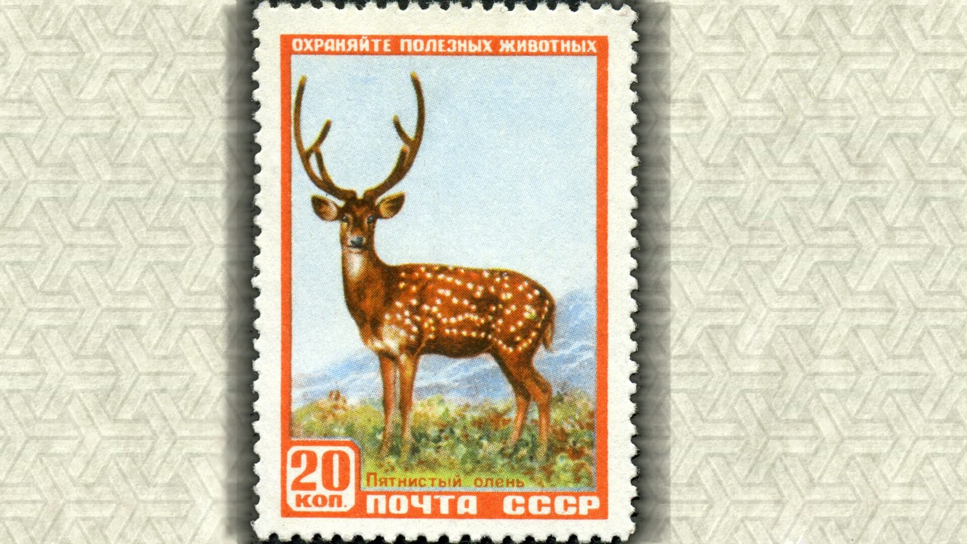 Советская почтовая марка с изображением пятнистого оленя. 1957 г. Серия «Фауна СССР». Художник А. Н. Комаров.