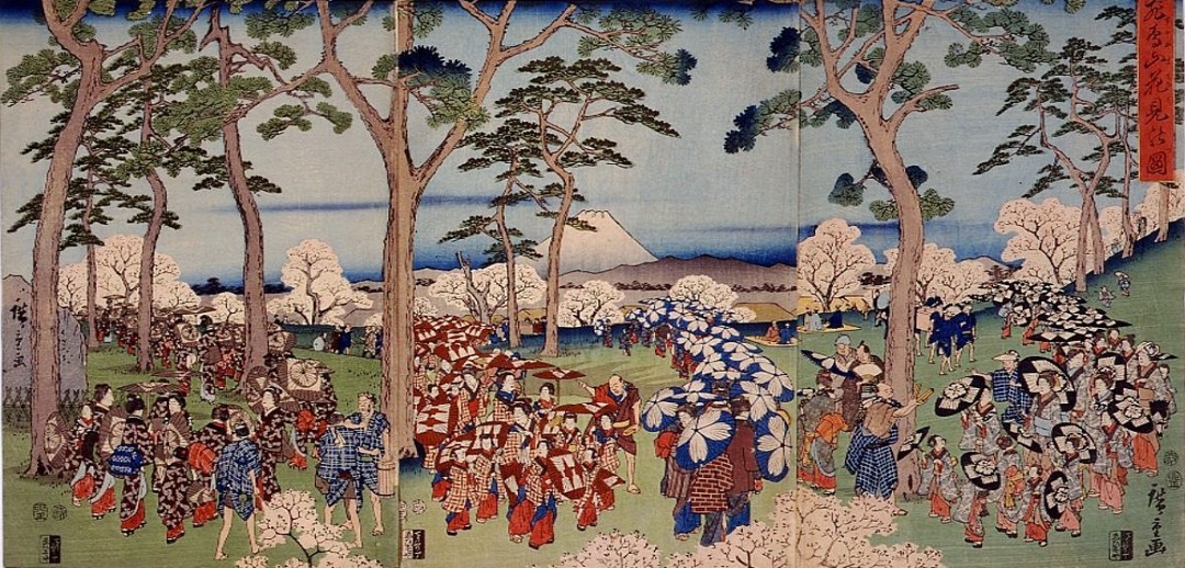 Любование сакурой в Асукаяме. Цветная гравюра на дереве. Утагава Хиросигэ. 1855 (?)