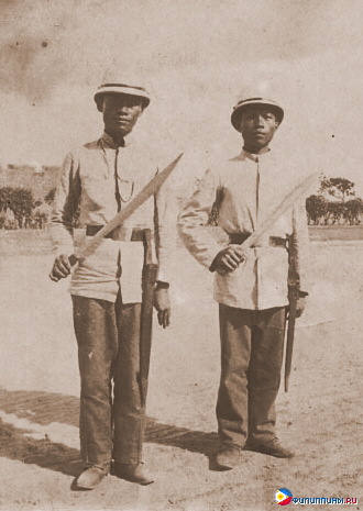 Филиппинские офицеры полиции, вооруженные разными видами боло. Остров Себу, нач. XX в.