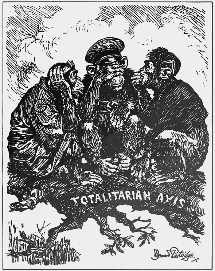 К началу Второй мировой сэр Бернард Партридж — главный карикатурист «Панча» и перед ним стоит задача дать ответ на офомление тройственного пакта «стран оси». Решение, предложенное Партриджем, как говорится, «витает в воздухе»: изобразить врага обезьянами. Мы недавно рассматривали момент из чуть более позднего американского агитационного мультфильма, в котором Гитлер, Муссолини и Хирохито изображены в виде трех обезьян