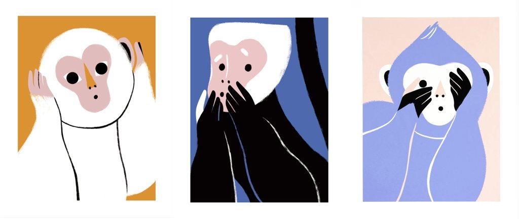 Нам всегда крайне любопытны производные композиции, меняющие классическую схему из трех обезьян. В этом случае художница предлагает действующим лицам уникальные атрибуты. Интересно, что один из них (певчая птица) совпадает с триптихом великого японского обезьяньего художника Сосэна Мори, но обезьяна Сосэна от трелей птицы закрывалась.