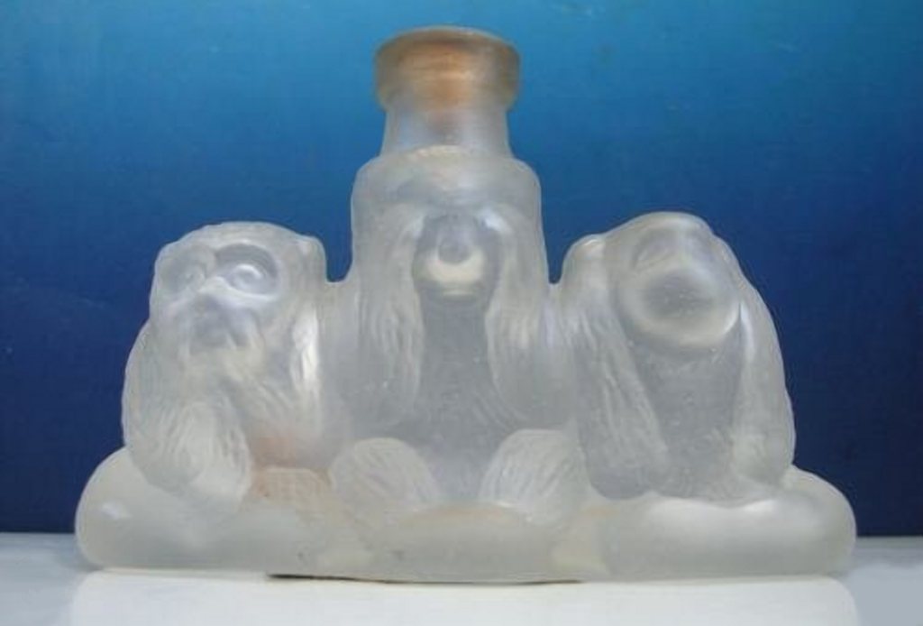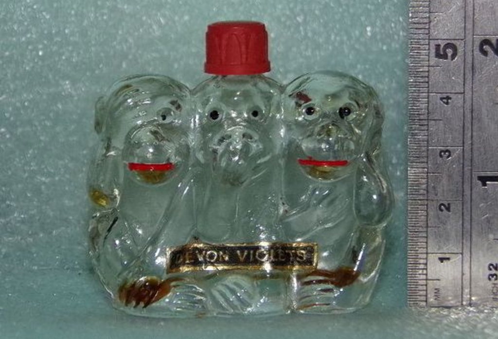 Продавец из Австралии выставлял на торги флакон в форме трех обезьян, но не такого массового производства. Это матовое стекло. Сами фигуры обезьян (они здесь более классические в сравнении с английскими) выдуты в форме, но горловина сформирована стеклодувами вручную. И пробка здесь не резьбовая, а внутренняя. Эта технология старее той, по которой сделаны бутылочки, приведенные выше. И смена технологий происходила все в те же 1930-е гг. То есть бутылочку осторожно можно датировать 1910—30 гг.