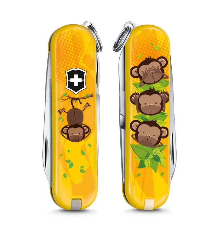 У «Викторинокса» есть традиция устраивать конкурс на оформление ограниченных коллекционных серий своих ножей. Среди победителей оказался яркий, детский по стилистике рисунок с тремя обезьянками на одной накладке и всего одной, висящей, уцепившись хвостом за ветку на другой.
